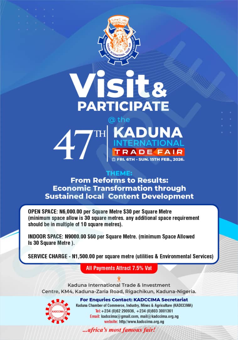 The Kaduna Chamber of Commerce, Industry, Mines & Agriculture (KADCCIMA) has officially announced the 47th edition of the Kaduna International Trade Fair, set to take place from Friday, February 6 to Sunday, February 15, 2026, at the Kaduna International Trade & Investment Centre, Rigachikun.