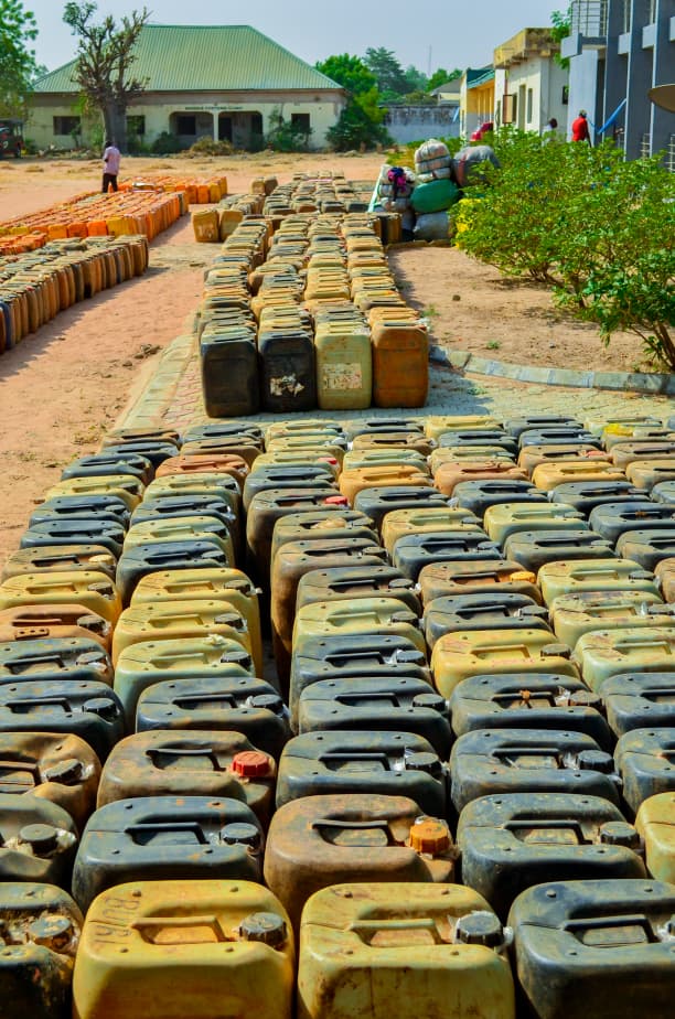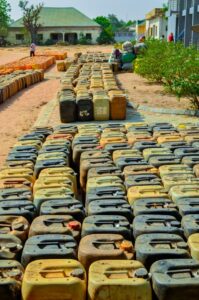 seized jerry cans of smuggled Premium Motor Spirit (PMS) by the Area Command of the Nigeria Customs Service (NCS) Adamawa/Taraba Area Command led by Controller Muhammed Yusuf Tako, recording