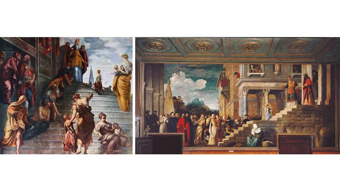 Tintoretto (left) and Titian’s versions of the Presentation of the Virgin (Credit: Getty Images)